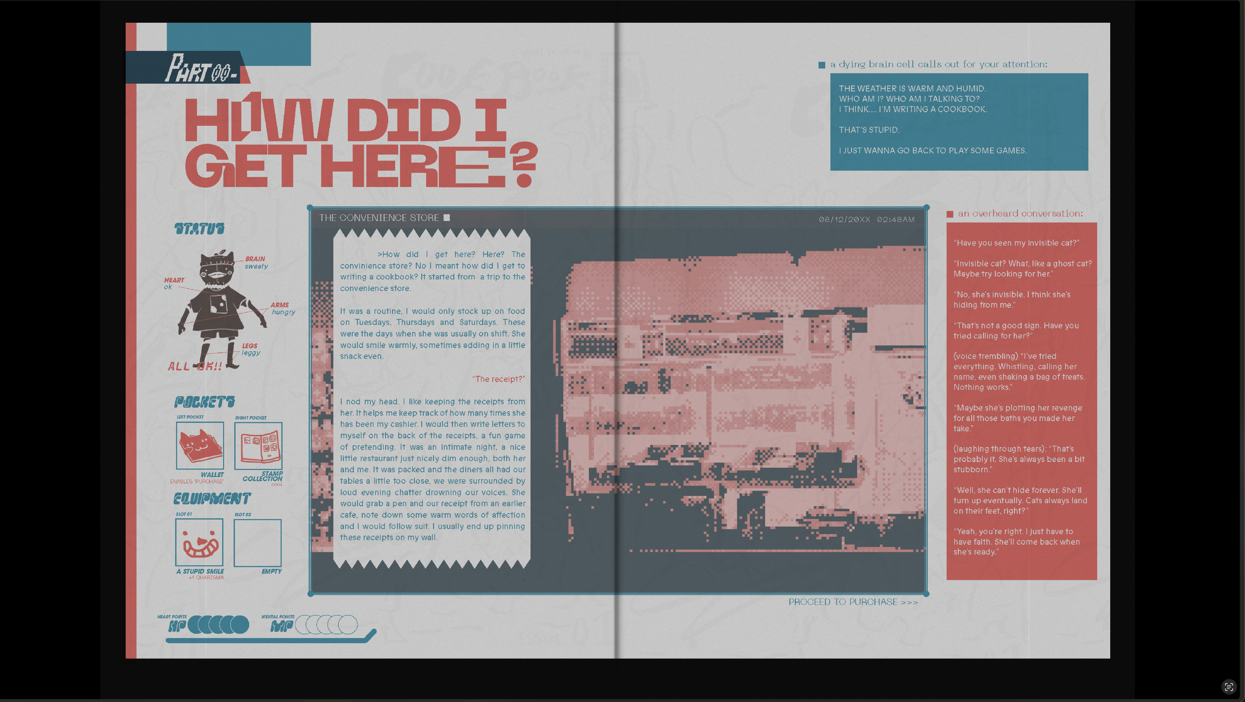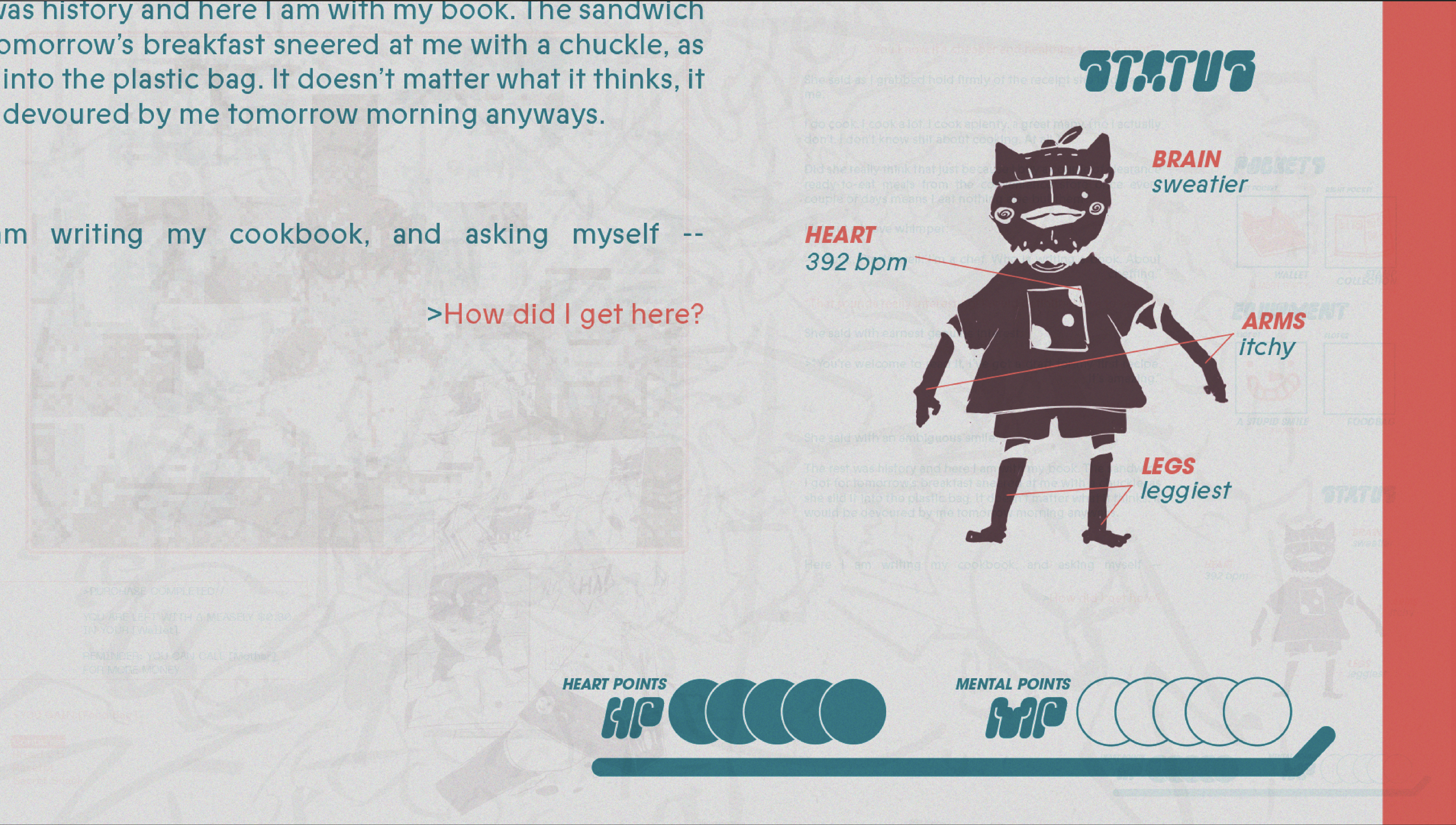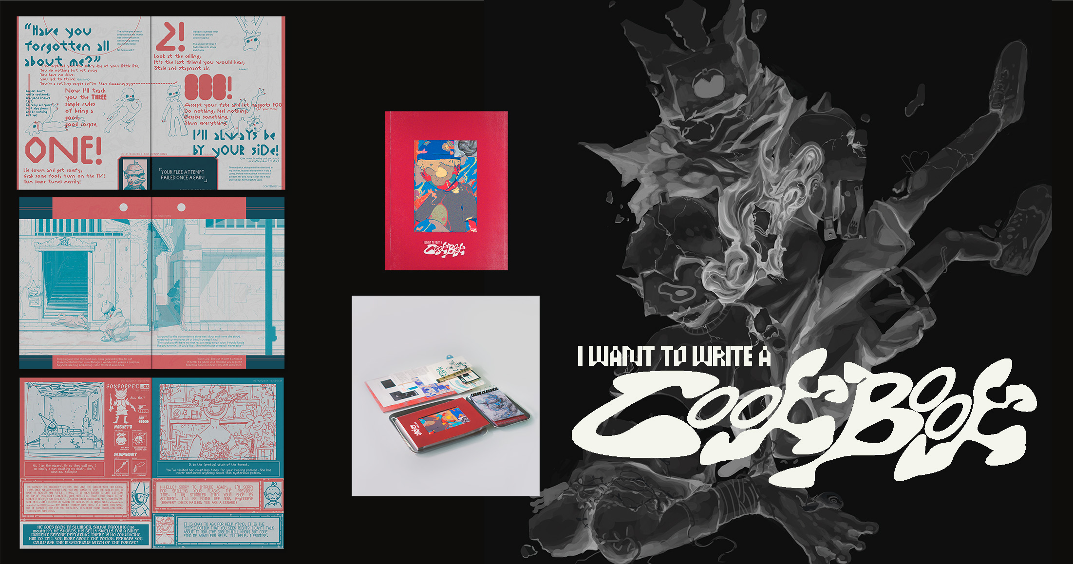 I WANT TO WRITE A COOKBOOK is a graphic novel that takes on the form of a cookbook-journal seeking to experiment with non-conventional storytelling on print and ergodic literature. It jumps from various mediums through journal entries, game screens and of course recipes centering around an odd boy with his existential dread.