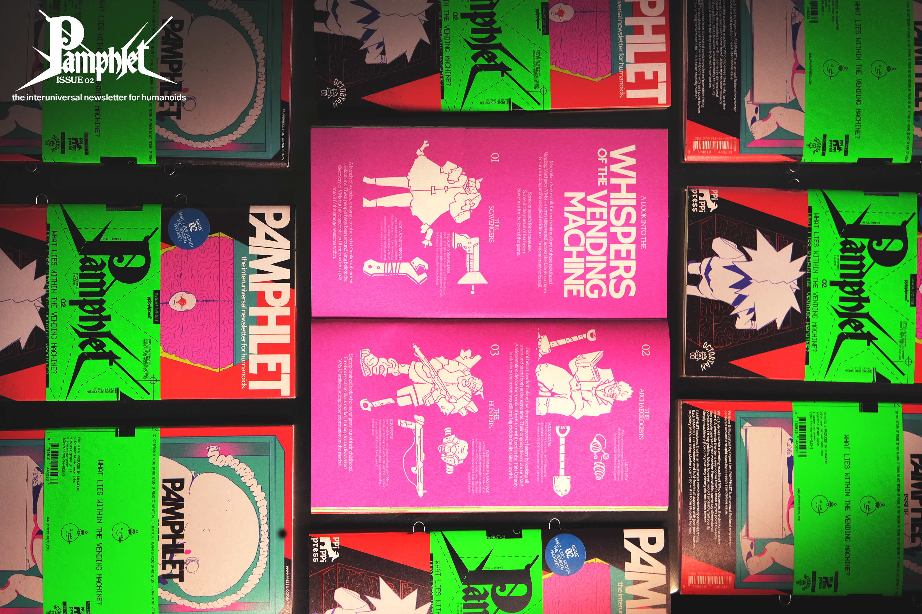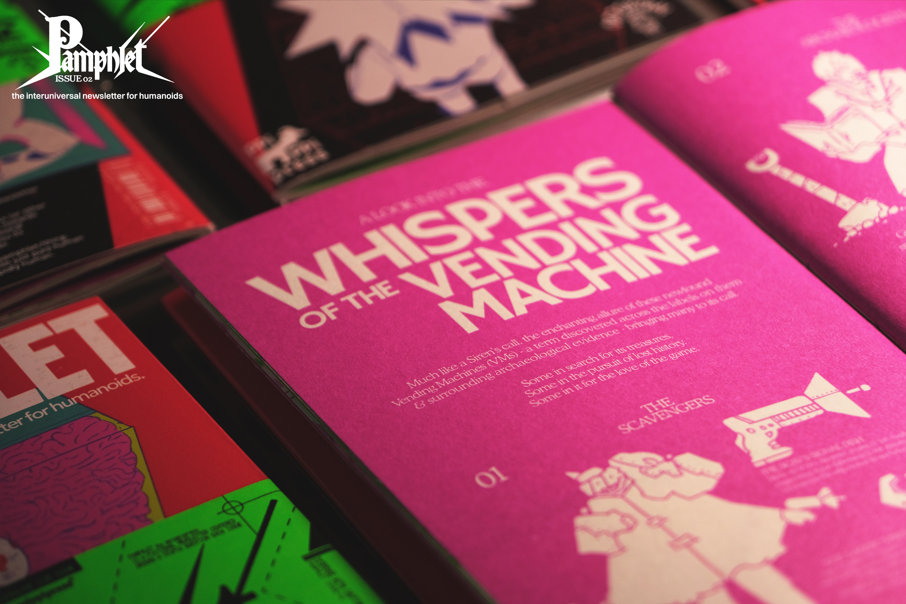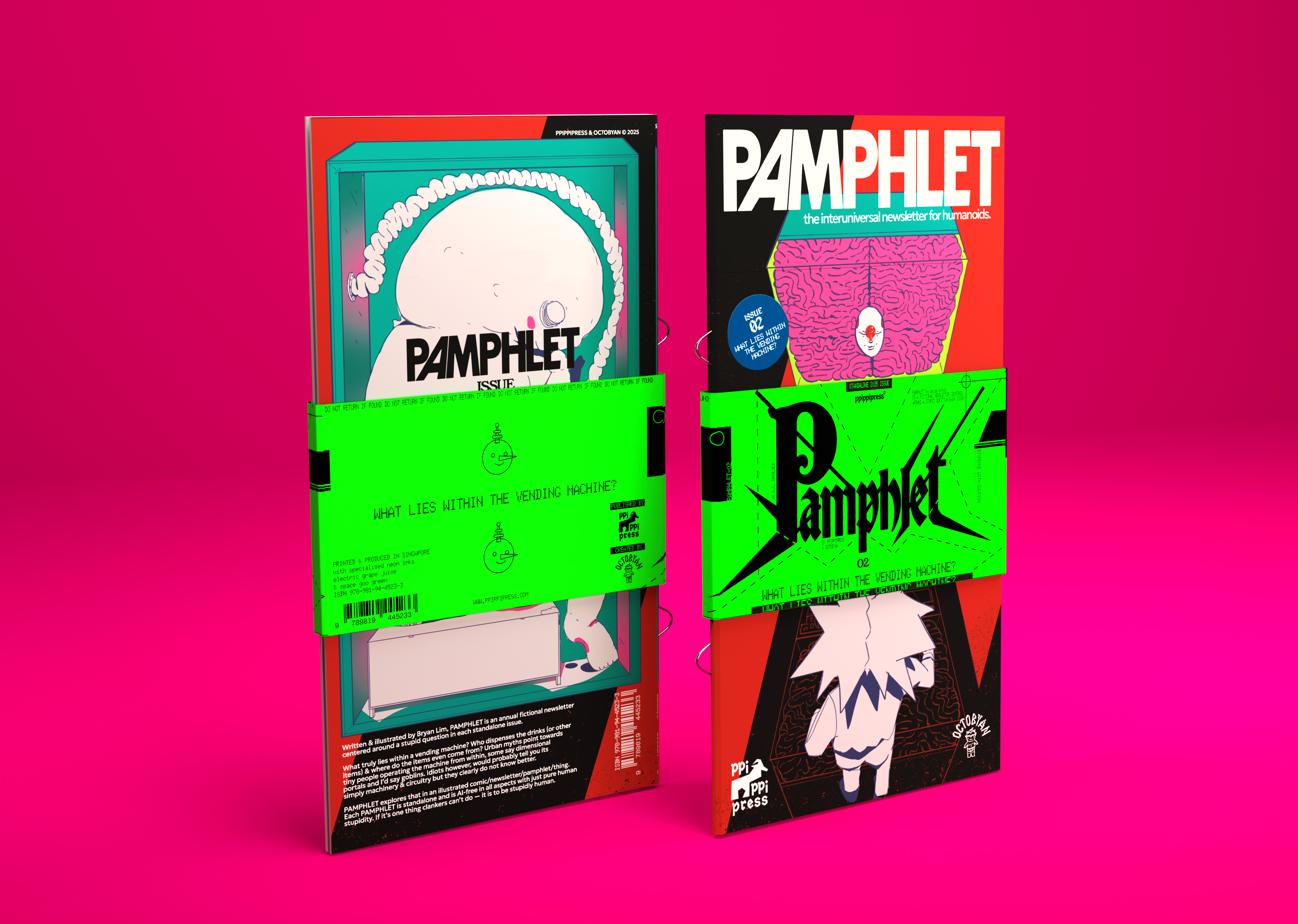 PAMPHLET is an annual fictional newsletter series, with each issue centred around an absurd question. Its contents take the form of an abstract mix: Articles, interviews, reports, and even recipes, forming an overarching fun narrative that answers the question ridiculously. A light-hearted reminder to embrace pointless absurdity by asking & answering 'stupid' questions, in the face of an increasingly optimised Al-driven age. The double debut issues explore what the moon might taste like & what might be truly inside a vending machine. Offset printed in specialised spot inks instead of regular CMYK.