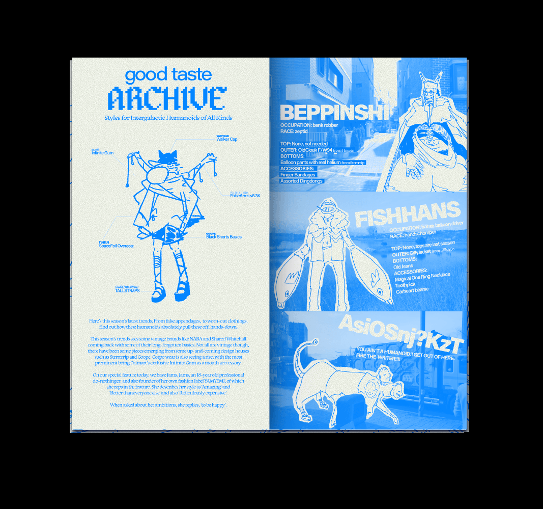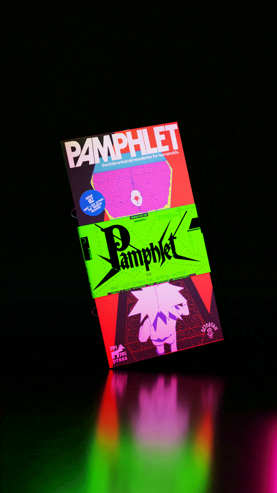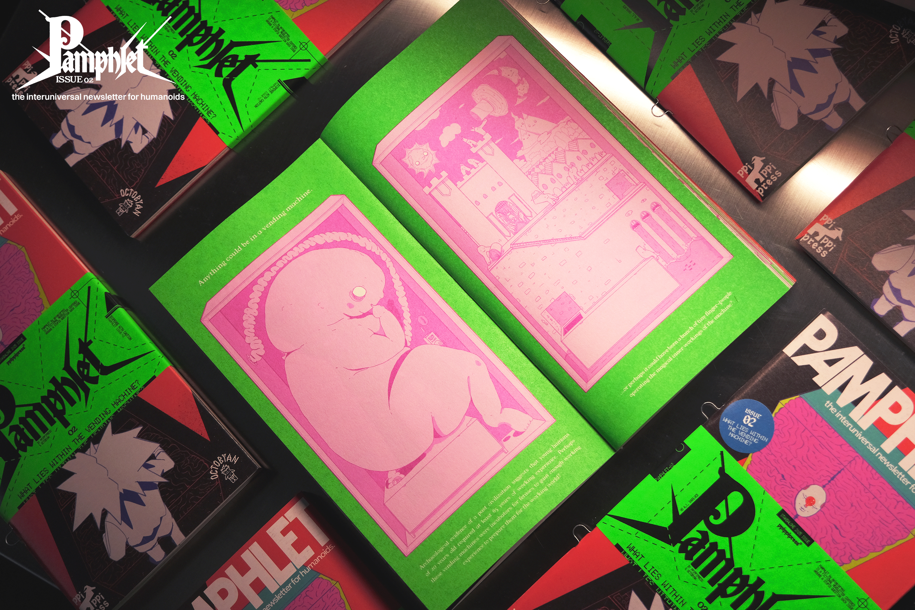 PAMPHLET is an annual fictional newsletter series, with each issue centred around an absurd question. Its contents take the form of an abstract mix: Articles, interviews, reports, and even recipes, forming an overarching fun narrative that answers the question ridiculously. A light-hearted reminder to embrace pointless absurdity by asking & answering 'stupid' questions, in the face of an increasingly optimised Al-driven age. The double debut issues explore what the moon might taste like & what might be truly inside a vending machine. Offset printed in specialised spot inks instead of regular CMYK.